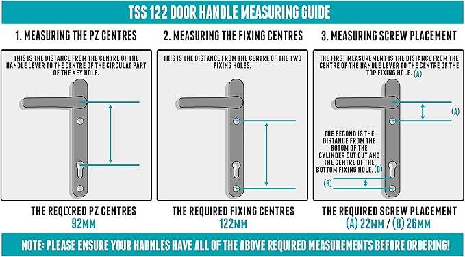 When measuring your door handle on your upvc or composite door there are two key measurements which need to be correct to ensure your replacement is a perfect fit. We have included a measuring diagram in the image gallery in addition to this guide.